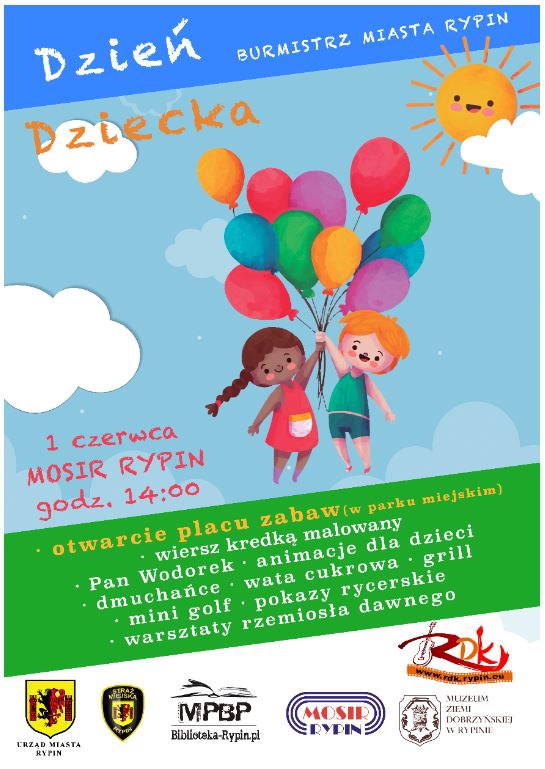 Burmistrz Miasta Rypin Paweł Grzybowski zaprasza wszystkie dzieci na obchody Dnia Dziecka, które odbędą się na terenie Miejskiego Ośrodka Sportu i Rekreacji w dniu 1 czerwca w godzinach od 14:00 do 17:00.