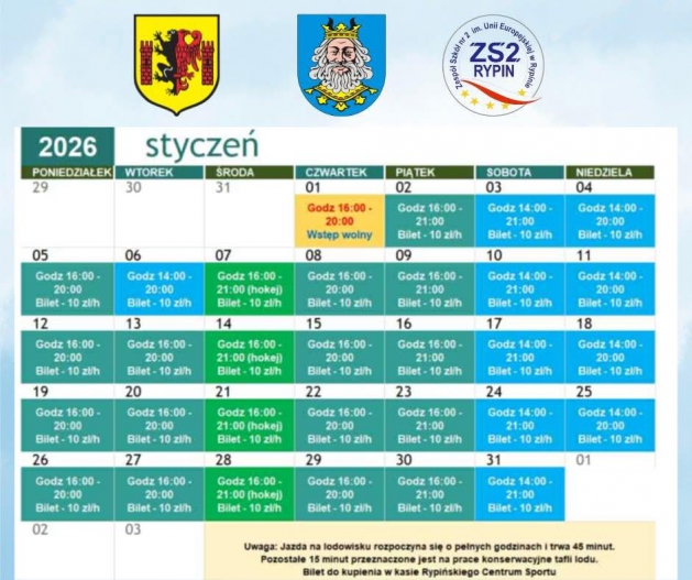 Przedstawiamy harmonogram funkcjonowania lodowiska na styczeń 2026.