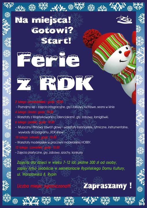 Rypiński Dom Kultury serdecznie zaprasza wszystkie zainteresowane osoby na zapisy na ferie organizowane przez naszą instytucję.